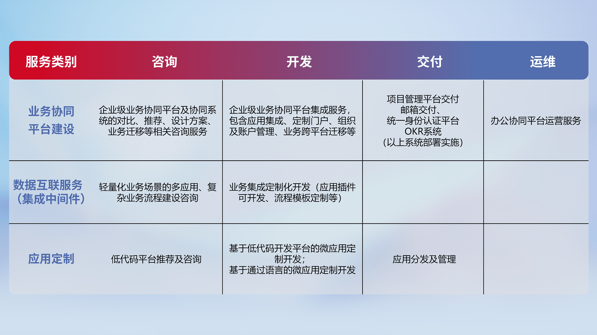 针对钉钉、、、企微、、IDaas等平台级产品提供产品的规划、、方案、、、、交付、、定制化开发等服务,,实现如统一协同办公、、、、智能客户服务、、混合会议管理、、智能数据查询、、等业务场景,,,,实现数字化转型。。。。